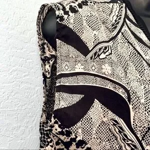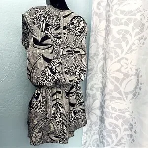 Cute black & cream abstract print romper. Surpluce v-neck with snap closure. Black cutout trim at neckline. Sleeveless. Elastic waistband. Hand pockets. Cuffed shorts. The shorts are fully lined. Lightweight polyester/spandex fabric. NWOT. Never worn. In excellent condition. ANGL Size Small