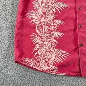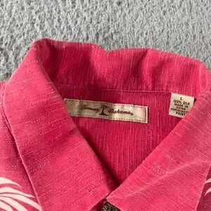 Tommy Bahama Silk Button Up Shirt Short Sleeve Hawaiian Adult Pink Palm Trees L. Condition is "Pre-Owned." please see photos for condition. Shipped with USPS Ground Advantage.