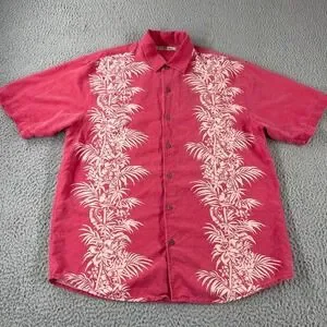 Tommy Bahama Silk Button Up Shirt Short Sleeve Hawaiian Adult Pink Palm Trees L