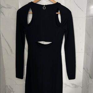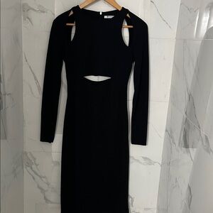Fitted black long-sleeve midi dress with a center waist cutout. Clean crew neckline and sleek silhouette. Minimalist design ideal for evening events. Stretch fabric for a close, comfortable fit.
