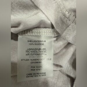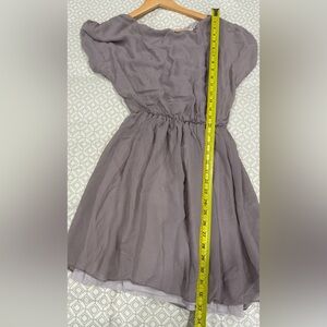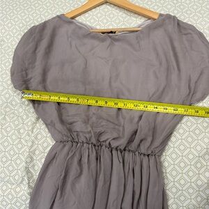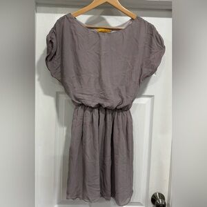 Lightweight slate gray mini dress by Alice + Olivia. Relaxed bodice with gathered elastic waist. Short sleeves and a flowing skirt. Simple and versatile for day or night.