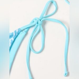 Keywords: blue bikini, leopard print bikini, women's swimwear, summer beachwear, cheeky bikini, triangle top, adjustable ties, customizable fit, beach party outfit, poolside fashion