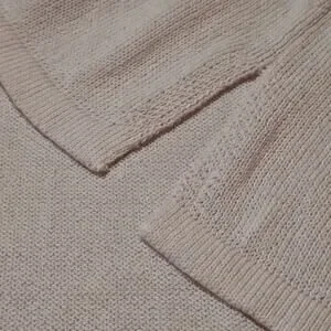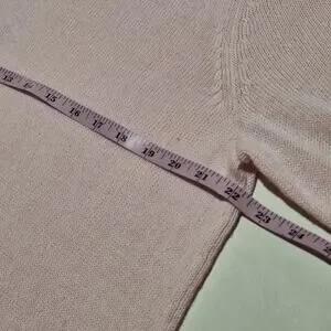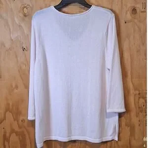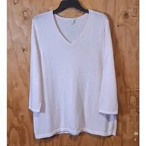 This sweater from Talbots is in excellent preowned condition and was barely worn - no flaws. Pale Pink. V-Neck. 3/4 Sleeves. Side Slits. Lightweight, Polyester and Linen. Women's Size XL.