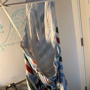 Halter-neck midi dress with diagonal multicolor stripes. Fit-and-flare silhouette with a gathered waist. Lightweight, breezy fabric. Easy, polished look for daytime wear.