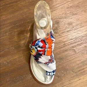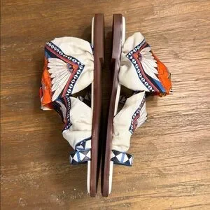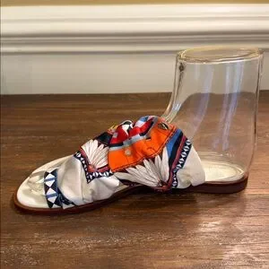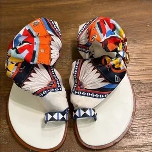 Flat leather lightly padded sandal with a brass T- buckle that cinches a multicolor scarf across forefoot