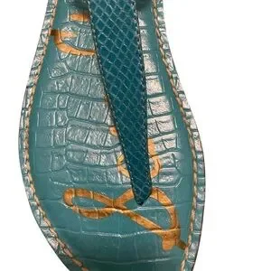 Chic teal sandals with gold accents. Ideal for summer outings.