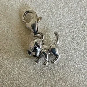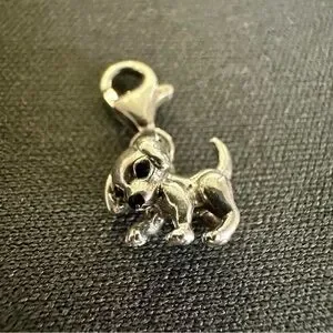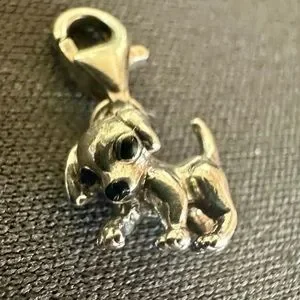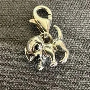 Adorable puppy dog charm with detailed sculptural design and attached lobster clasp—perfect for charm bracelets, necklaces, or pet-lover collections. The charm is marked “TS 925” (see photos) and features a polished silver-tone finish with lifelike detailing.