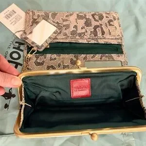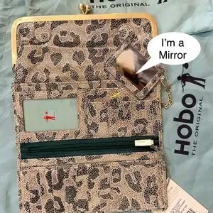 Chic HOBO wallet with a bold shimmer leopard print. Features wonderful black,tan and brown tones.
