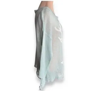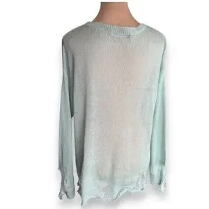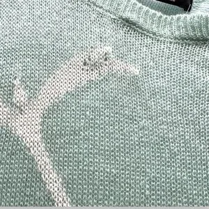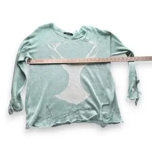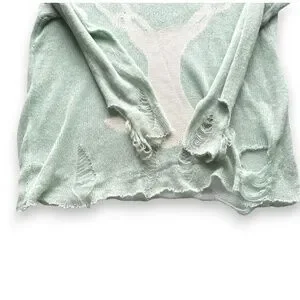 Soft lightweight mint knit sweater by ROMWE featuring deer graphic and intentionally distressed edges. Sheer loose knit with relaxed fit and raw hem details. Very soft feel. No size or fabric composition tag present.