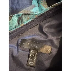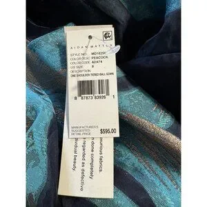 Aidan Mattox ball gown/dress in a women's size 8. Rich peacock blue with metallic goldtone accents. One shoulder style with tiered rows of fabric on the skirt. Has a hidden side zipper. Fully lined, made of polyester/nylon and metallic threads. Has non slip strip around the inner top of bust.
