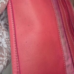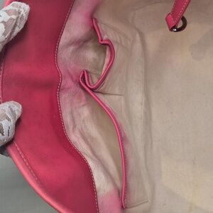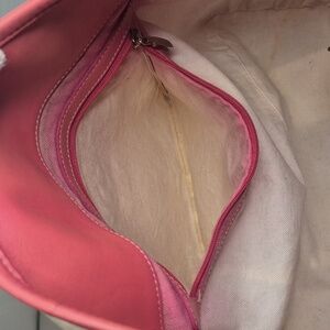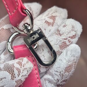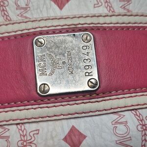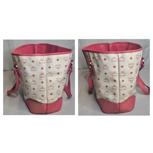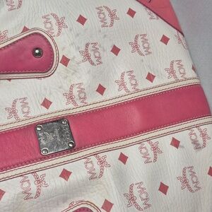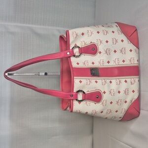 MCM shoulder tote with signature logo print. Cream & pink leather with 2 handles. Structured silhouette with metal ring accents. Everyday style with refined details. Has been professionally cleaned and conditioned inside and out.... Has some staining inside/outside.