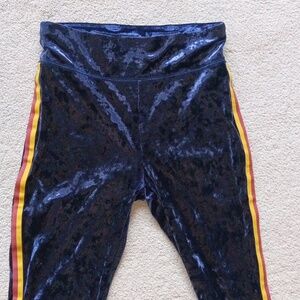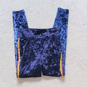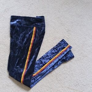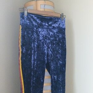 Aerie Velvet Leggings in Blue with Yellow and Red Stripes New without Tags. Perfect condition Size M fits like S Stretchy, but not much Waist 13"-15" stretch Elastic Band Inseam 27.5" Hi-Rise 12" Hip 17" Thigh width 9" Hem width 3.75" No pockets Lay-flat measurements are approximate Soft velvet leggings in rich blue. Features bold yellow and red side stripes. Comfortable and stylish for any occasion.