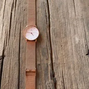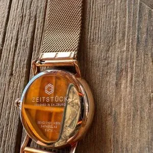 German microbrand dress or business watch Featuring a sophisticated gold mesh band and a pristine white dial. Simple and elegant it’s powered by the reliable Seiko VH31 quartz movement and features a sapphire crystal.