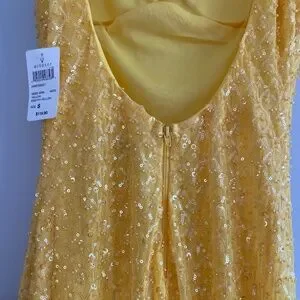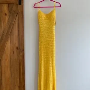 Very pretty yellow, In brand new condition with tags, bought it for prom but never wore it.