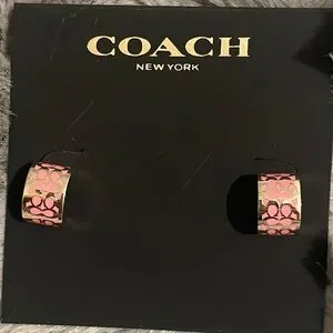 Coach Signature C Pattern Pink and Gold Enamel Huggie Earrings NWT