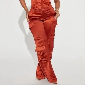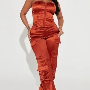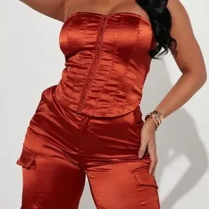 Elegant strapless satin jumpsuit in a rich rust color. Features a structured corset-style bodice and utility cargo pockets for a modern edge. Smooth satin finish offers a polished look for evening or events.