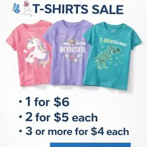 Charming tees with unicorn and dinosaur prints. Vibrant pink, purple, and teal colors. Ideal for playful outfits.
