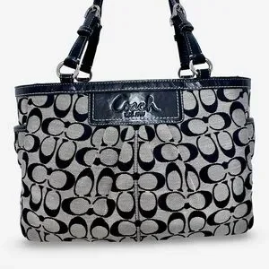 Classic and functional Coach Signature Turnlock Tote featuring durable jacquard canvas with leather trim and polished silver hardware.