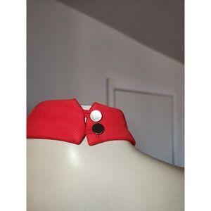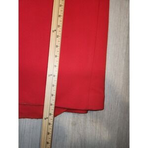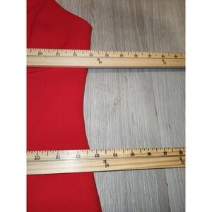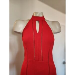 Sleek red maxi dress features a sophisticated halter neckline with a keyhole cutout and intricate ladder-stitch detailing along the bodice. Designed with a form-fitting silhouette, this gown includes a high back slit for ease of movement and a secure zip closure. The vibrant crimson hue and tailored seams create a polished, elegant look suitable for formal events or evening galas. Note that there is some visible darkening/soiling along the bottom hem as shown in the photos.