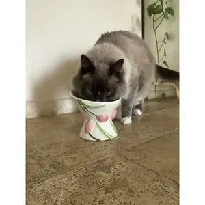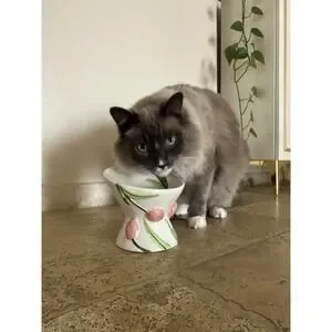 Mellow & Mod Cat Drinking Water Tall Bowl "Pink tulips" Hand Painted Colorful