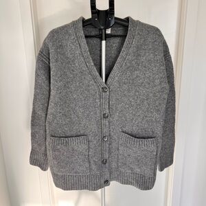 Wilfred V-neck cardigan with front buttons. Features two patch pockets and ribbed trim. Soft knit for easy layering. Neutral gray pairs with many outfits. Tho has been washed and has shrunk a little . It was quite large to begin with though so is probably more like a small now .