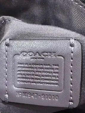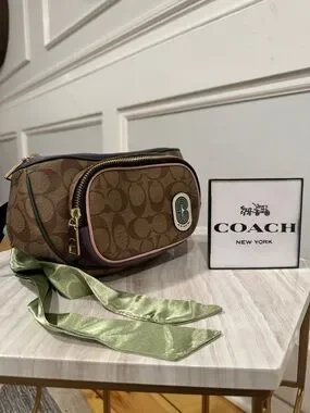 Coach logo patch on front. Classic brown signature canvas. Pink leather trim accents. Gold-tone hardware. Compact crossbody style. Versatile and chic.