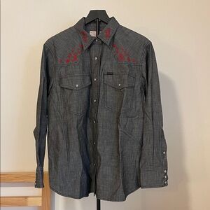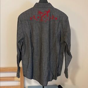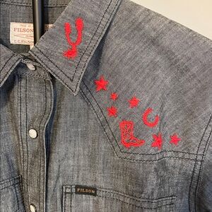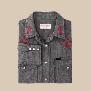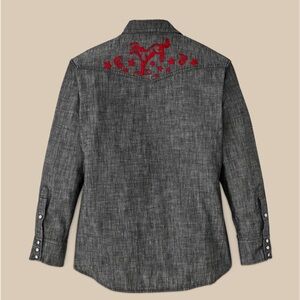 A Western-style shirt made with cotton chambray, a lightweight and durable fabric rooted in classic workwear. True to tradition, the pockets and yoke are pointed and the front and cuffs secure with snaps. Wildlife embroidery on the front yoke and back add a bit of flair. Spread collar and shirttail hem.