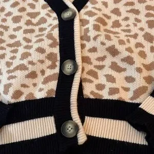 Stylish leopard print cardigan. Features black trim and buttons. Perfect for layering.
