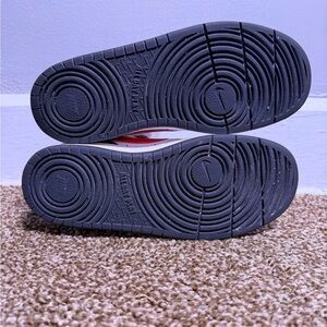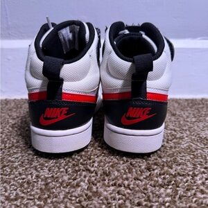 Sporty Nike mid-top silhouette. White leather upper with red Swoosh accents. Black details on toe and heel. Clean, athletic look for everyday wear.
