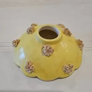 Bright yellow ceramic candle holder with delicate beige floral accents and scallop rim. Adds a cheerful pop of color to mantels, tables, or shelves. Shows age, imperfections and discoloration.