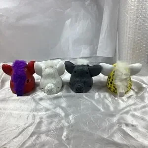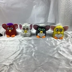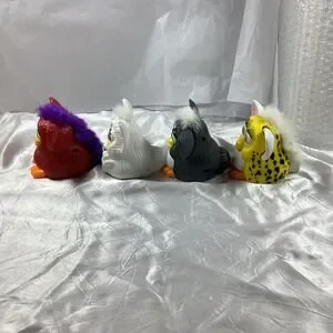 Vintage Furby McDonald's Happy Meal toy collection includes four distinct figures from the 1999 release. This set features the red Furby with purple hair, the all-white Furby, the black and grey Furby, and the yellow leopard print Furby. Each plastic figure captures the classic electronic pet aesthetic with textured molded details, large ears, and tufts of faux fur. These nostalgic collectibles are perfect for 90s toy enthusiasts or Furby fans looking to complete their promotional toy sets.