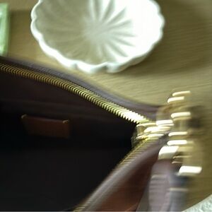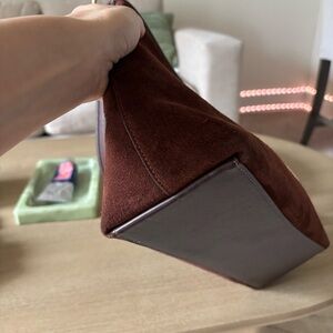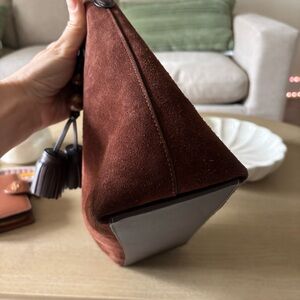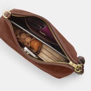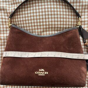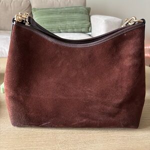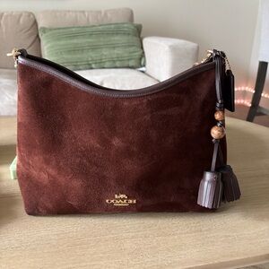 Chic Coach shoulder bag in rich mahogany suede. Features elegant tassel and bead accents. Ideal for versatile styling.