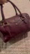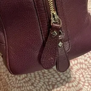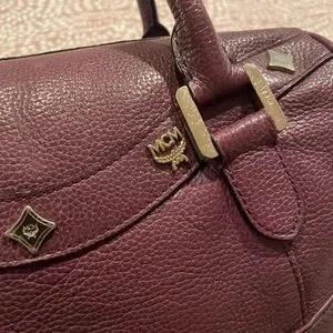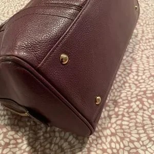Structured pebbled leather Boston bag with decorative gold studded logos hardware and dual top handles. Classic silhouette for everyday use. Rich plum purple color pairs well with many looks. Scratches on hardware and zipper pull has mark and signs of wear and corners have minor rubbing. Interior has zipper compartment and two pockets. Comes with COA.
