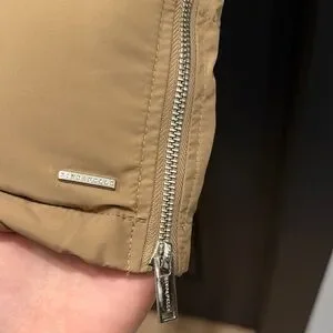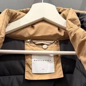 Lightweight sleeveless puffer vest in camel with a removable hood. Features front snap-and-zip closure and handy side pockets. Warm, versatile layering piece that pairs well with sweaters and long sleeves. Comfortable, casual style in a neutral camel color. The brand Rino & Pelle is known for great quality and design from Europe. Length 36 inch, chest 22 inch