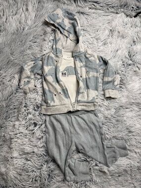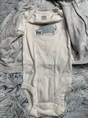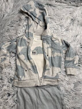 Adorable gray Elephant hoodie with matching onesie top and pants. Perfect for keeping your little one cozy and stylish. 3/6 months. Good pre loved condition