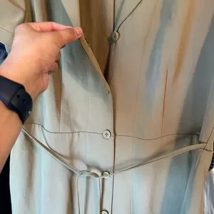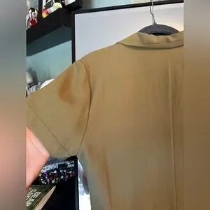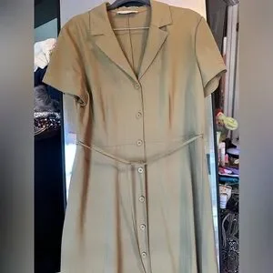 Such a cute and timeless Shirt dress in a off-green, tan color. The official color is "olive green"- as you can tell by the photos it's a bit tough to see. I would say it's a perfect medium between a green and tan, perhaps greener in person. Great for fall!