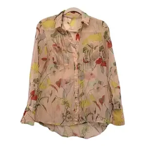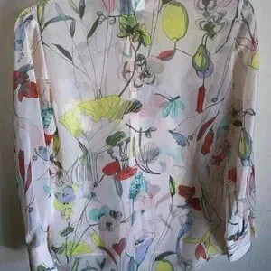 Gorgeous sheer botanical print button down blouse. Very light rose colored shirt with yellows, reds, blues.