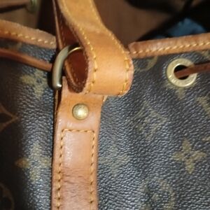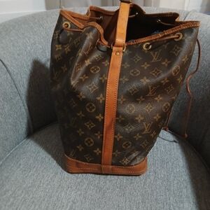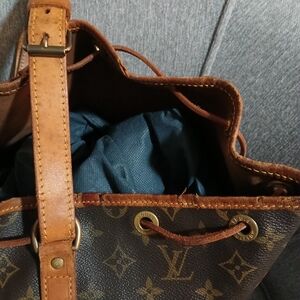 Louis Vuitton drawstring in classic brown monogram canvas. Features adjustable leather drawstring closure and leather trim. Timeless design for everyday carry. Brown color complements casual and smart looks. Cracking in leather, but not in the canvas, please view all photos.