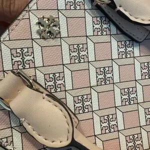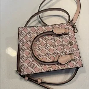 Stylish pink patterned mini tote with matching detachable crossbody strap. Features a structured silhouette and dual top handles for versatile carry. Subtle designer logo hardware adds polished detail. Perfect for carrying essentials with a feminine touch.