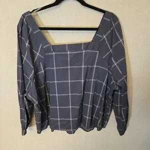 Stylish gray blouse with window pane check design. Features a unique square neckline and 3/4 sleeves. Like new condition.