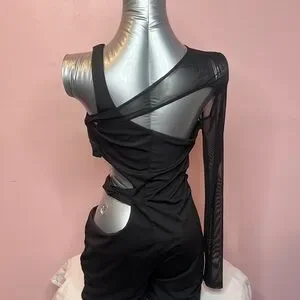 Stylish black romper with a unique one-shoulder design. Features mesh detailing for a chic look.