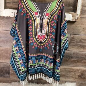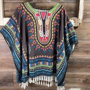 Party, Festival, Boho, Artsy, Art to Wear, Art Teacher, Floral, Southwestern, Hippie, Lagenlook, Oversized, Flowy, Fringe, Poncho, Colorful, Beachy, Swim-cover, Vacation