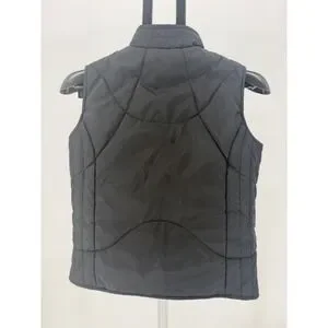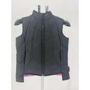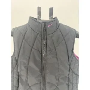 Sporty vibes radiate from this Nike quilted puffer vest. The sleek black exterior is accented with vibrant pink stitching and a subtle pink Nike logo at the collar, adding a pop of color to any outfit. Its quilted design provides cozy insulation, perfect for layering during transitional weather. The full zip front allows for easy on and off, while the stand-up collar offers extra warmth. This versatile vest is ideal for active playdays, outdoor adventures, or casual everyday wear.