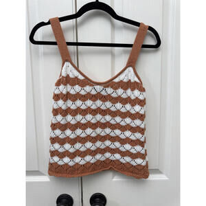 Cute fab’rik crochet knit tank top featuring a rust and cream striped pattern with a textured scalloped knit design.