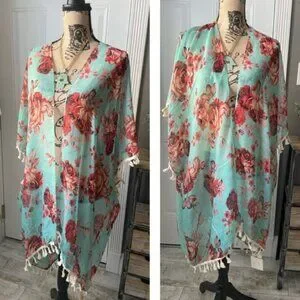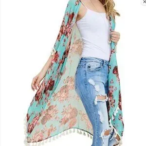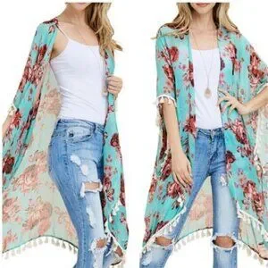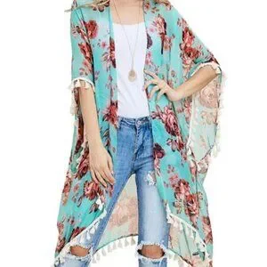This is a pretty green lightweight kimono with floral pattern and fringe, in 100% polyester.