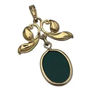 Art Nouveau revival pendant featuring flowing leaf motifs with a suspended oval green cabochon drop.