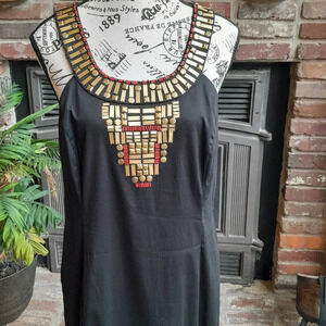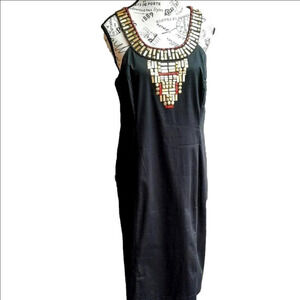 S ize 1 4 Like New This is a gorgeous Black Cocktail dress with Gold and red accents. Sleeveless with back slit.