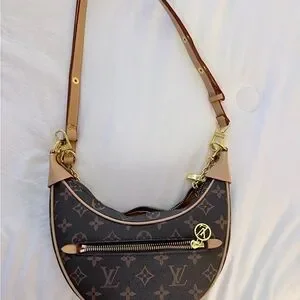 Classic Louis Vuitton monogram crescent silhouette. Front zip pocket with gold-tone zipper and LV charm. Leather trim and chain-accented shoulder strap. Compact and stylish for day-to-night wear.