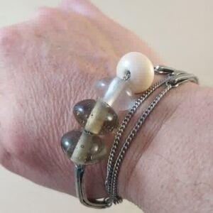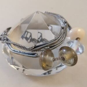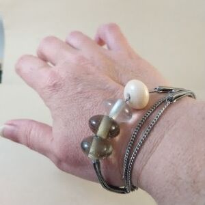 Stylish silver-tone multi-strand bracelet featuring olive green glass beads and a cream accent bead. Lightweight and versatile for everyday wear. The silver finish pairs beautifully with the olive and cream tones for a refined look.