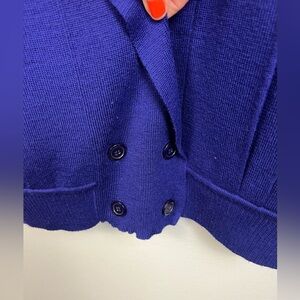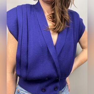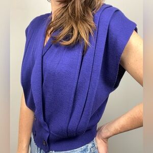 Bold 80s style, vibrant indigo-purple hue, cropped sleeveless silhouette, double-breasted front, button waist detail, cap-style short sleeves, vertical pleating across front and shoulders, retro preppy aesthetic, statement vintage knit, saturated color pop, structured yet playful fit, textured knit detail, heritage-inspired design, polished 1980s flair, eye-catching wardrobe piece, layered styling potential, high-fashion vintage vibe, bold statement piece, timeless colorful knit